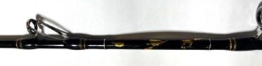 黒竹根付きグリップ 穂先は元竿に収納可能 テーパ部に黒・銀箔散らし ネーム入れ ブルーSICガイド 穂先2本、先端は逆光対応仕 上げで視認性向上 竿は上向きリール用 |
