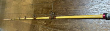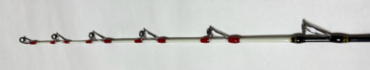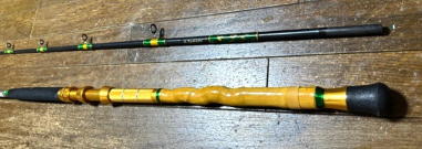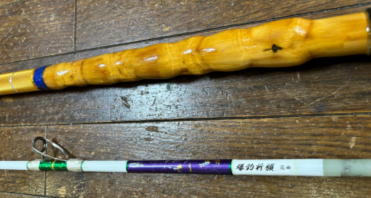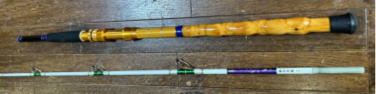 グラスソリッド使用 (穂先は硬、軟調の2本) アルミリールシート バットと竿先は2分割 バット部分には布袋竹使用 特にベイトの動きが判るよう 竿先を削り出し(硬、軟調の 2本)にチューニング。 穂先先端の感度と青物に負け ない穂先中央部のパワーがあ ります (リーズナブルな価格にて作 成可能です) |